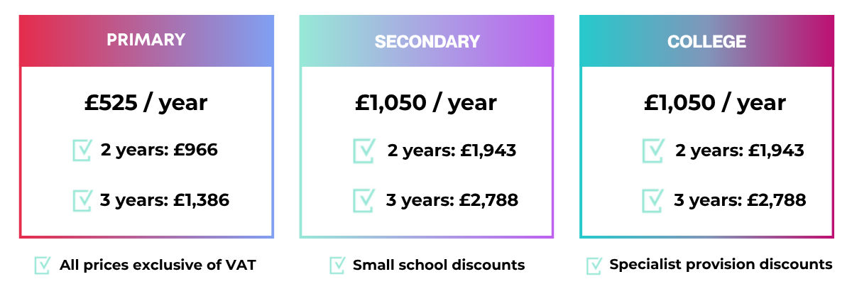 Multi-year plans and reduced rates for small schools & specialist provisions.